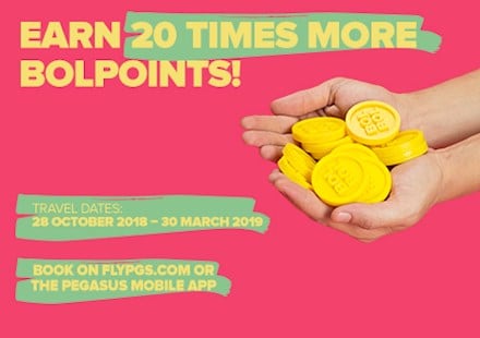 Pegasus BolBol Members earn 20 times more BolPoints on all flights booked between 20 and 22 September for travel anytime between 28 October 2018 and 30 March 2019. The more you fly, the more BolPoints you’ll earn – then you can fly even more!