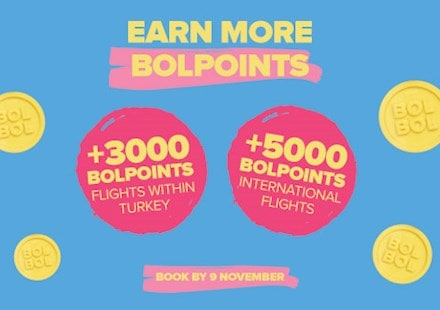 BolPoints will be earned according to the terms and conditions of the offer, with an extra 3,000 BolPoints available to earn in addition to the points available for a normal ticket purchase for flights within Turkey or to Cyprus; and an extra 5,000 BolPoints for every international flight.