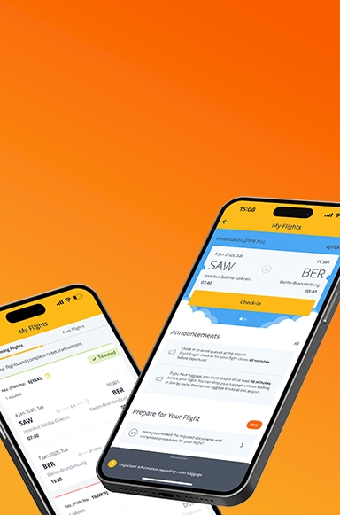 From the "My Flights" screen, you can view all information such as gate changes, cancellations, and delays. You can also perform many actions instantly, such as check-in, additional services, boarding pass access, and package upgrades.
